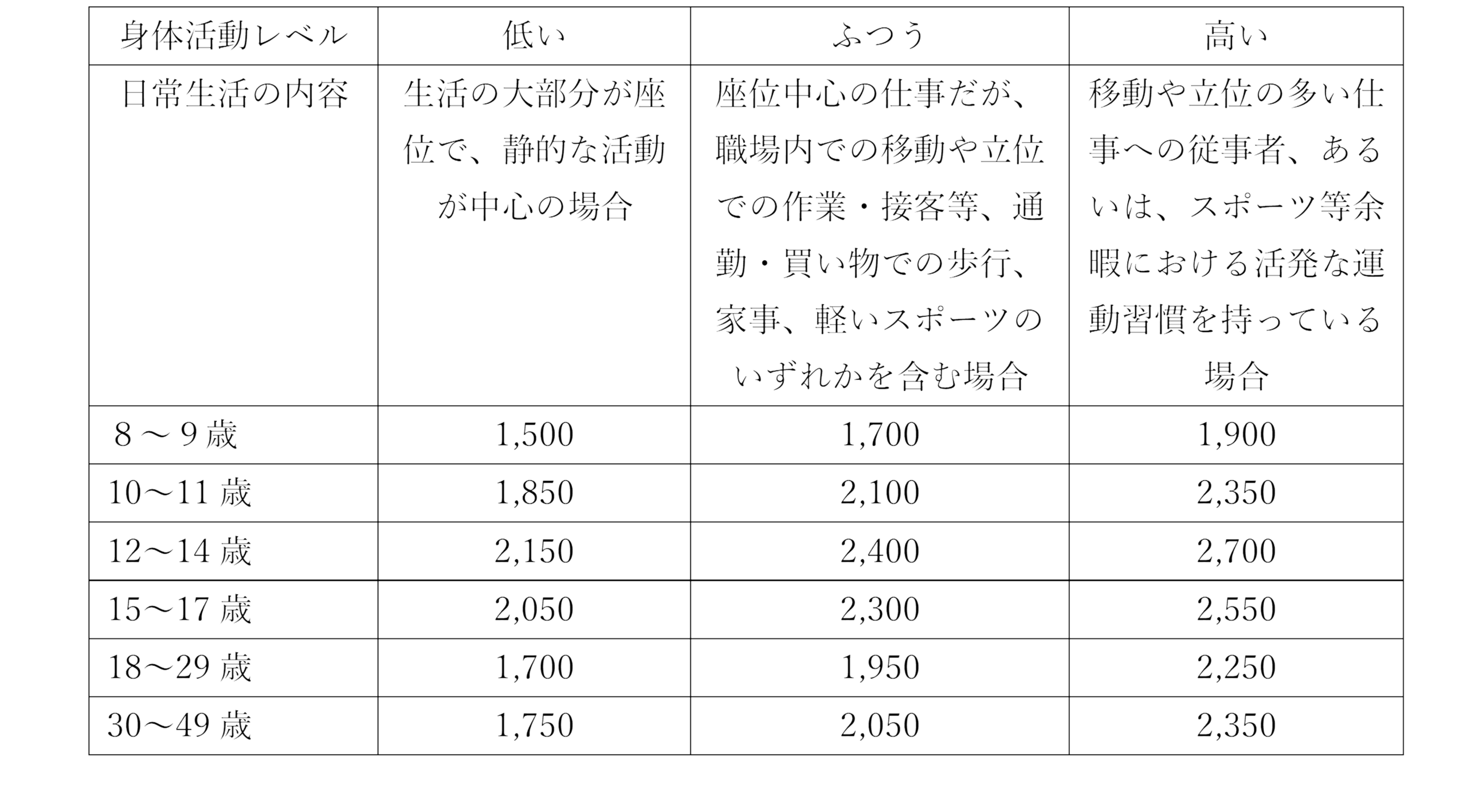 1日にどれくらいのエネルギーをとればよいかは、その人の体重や、運動でどのくらいエネルギーを使うかによってちがいます。「日本人の食事摂取(せっしゅ)基準2025年版」は、年れいや活動量ごとに必要なエネルギーと栄養素の量を調べることができます。ただし、アスリート専用の考え方ではありませんので、自分の運動量、食生活、体重・BMIなどを考えたうえで、エネルギー不足にならないようにします。