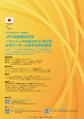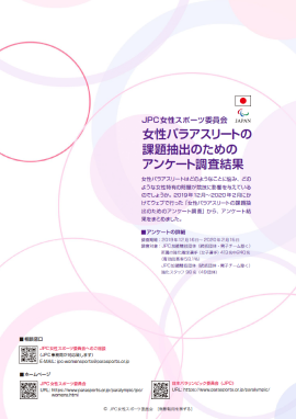 JPC女性スポーツ委員会が、2019 年12 月~2020 年2月にかけてウェブで行った「女性パラアスリートの課題抽出のためのアンケート調査」から、女性アスリートが抱えている悩み、女性特有の課題が競技に与えている影響、女性パラアスリートや女性コーチの置かれている環境等についてまとめた報告書。